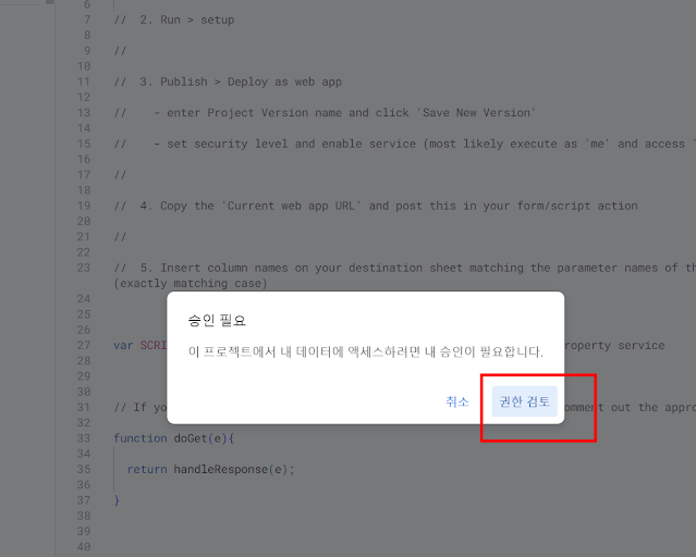 이제 스크립트를 웹 앱으로 배포하여 블로그와 연동합니다.